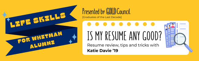 Join GOLD (Graduates of the Last Decade) alumni for an interactive resume review session with alumna Katie Davie '19. Katie will select three resumes (submitted by you!) to review live, giving tips of how to strengthen your resumes for the current job market. Submit your resume for Katie to review live. If your resume is one of three selected, you will receive a $25 gift card*!*Must be present at the event to be eligible.